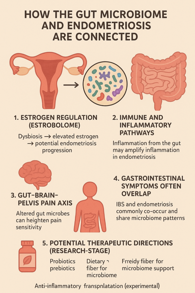 Studiile au arătat, atât pe model animal cât și la paciente, că endometrioza se asociază cu disbioza la nivel intestinal. Totuși, rezultatele studiilor nu sunt uniforme. Un studiu a raportat abundența bacteriilor din grupul Firmicutes în ciuda celor din grupul Bacteroidetes pe când un alt studiu a raportat exact contrariul. Ba, mai mult, un alt studiu nu a observat modificarea microbiotei în a 21-a zi de dezvoltare a endometriozei experimental la șoareci. Microbiota este foarte diversă și e nevoie de studii mult mai largi pentru a clarifica semnificația ei clinică la pacientele cu endometrioză.