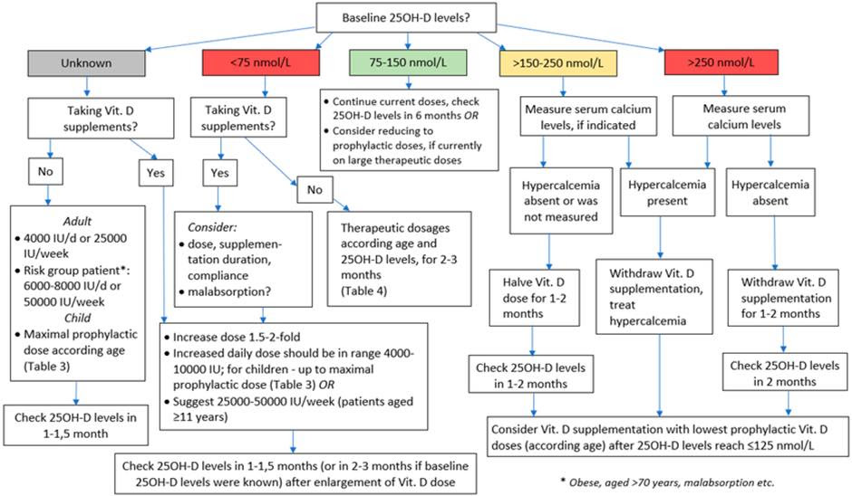 5. Necesarul de vitamina D depinde de varsta. Adultii au un necesar de 1000-2000 unitati de vitamina D, pe zi, dublandu-se la batranete. Tratamentul este si el in functie de necesar si afectiunile pare le are o persoana. Am atasat si un algoritm de management al deficitului de vitamina D. Atentie ca valorile sunt in nmol/ml si trebuie facuta conversia in ng/ml; o puteti face pe internet sau, simplificat, impartind valoarea din tabel la 2,5 – 100 nmol/ml este echivalentul a 40 ng/ml.